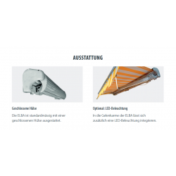 Die elegante Hülsenmarkise ELBA besticht durch ihre Eleganz und vereint die Stabilität einer offenen Gelenkarmmarkise mit dem Komfort einer Kassettenmarkise. Sie eignet sich ideal zur Beschattung von Balkonen und Terrassen oder auch an Geschäftsgebäuden. Die spezielle Armkonstruktion der ELBA zieht die Arme beim Schließen der Markise nach oben und verschließt die Markise fast vollständig. Dies bietet einen dichten Witterungsschutz für das aufgerollte Tuch. Die wartungsfreie Armkonstruktion mit Doppel-Stahlseilen sichert der ELBA eine besonders hohe Lebenserwartung. Die eingebauten Wickelrohr-stützen sorgen für eine gleichmäßige Spannung des Markisentuches. Die stabile Konstruktion des Stahl-Tragrohrs ermöglicht eine einfache Montage und bietet eine Vielzahl an Befestigungsmöglichkeiten.
