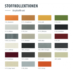 Das Markisengestell ist pulverbeschichtet in den Farben weiß ähnlich RAL 9003 und anthrazit ähnlich RAL 7024 erhältlich.